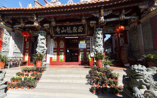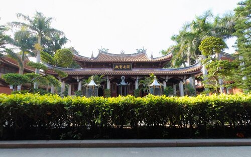 进入山门,便是弥勒佛殿,殿内供奉袒胸露、面带笑容的弥勒佛,背后韦驮天王,昂首挺立。出殿拾级而上,是寺内的主要殿堂枣大雄宝殿,殿内供奉着高达10米的释迦牟尼佛。其后为毗卢宝殿,雄伟庄严,正中供奉高约5米的金身毗卢遮那佛,弟子梵王、帝释侍立左右,二十诸天分列大殿两侧。佛后是海岛观音塑像,观世音伫立鳌头,善财、龙女侍女三旁,观音三十二应化身遍布全岛。堂内塑像,工艺精湛,入化传神,令人赞叹。