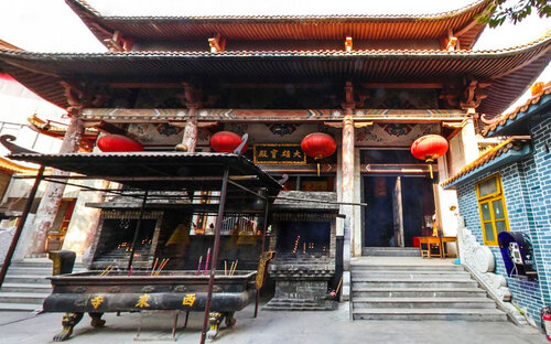 整个建筑群融南北风格于一体,红墙金瓦,翘角飞檐。称之为绝的是殿内满堂缅白玉佛像,玉质上乘,雕刻精美,古朴神韵;法相庄严,其中三世佛每尊都是用高5.8米,重30余吨的整块玉石雕刻而成,极为罕有。